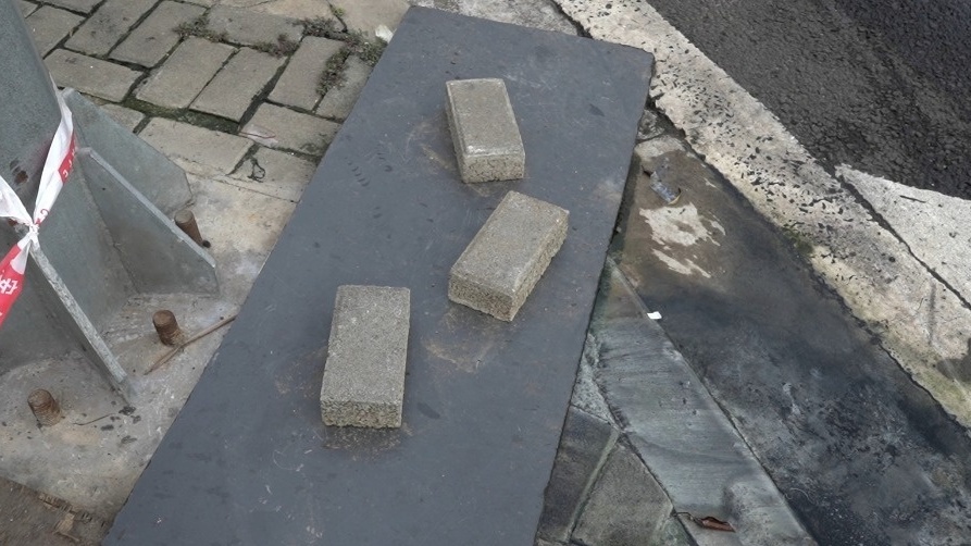 仔细查看这些路面的地板砖可见,表面十分平滑。记者在现场还使用一瓶矿泉水进行了实验,将水倒在个别地板砖上,再用手去触摸感受,发现的确很平滑,摩擦力很小。