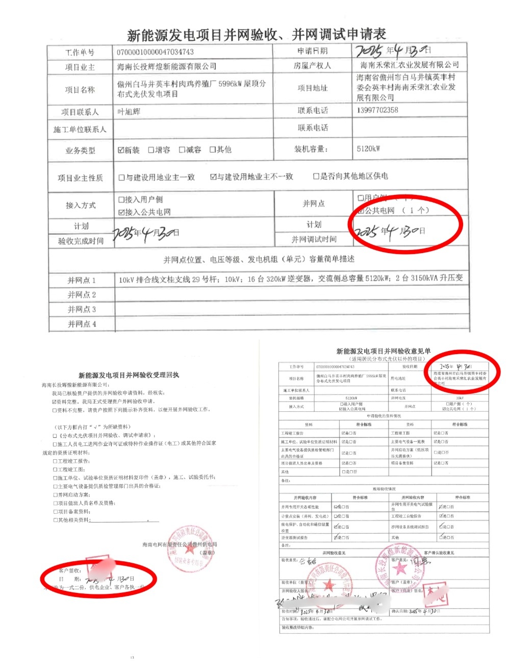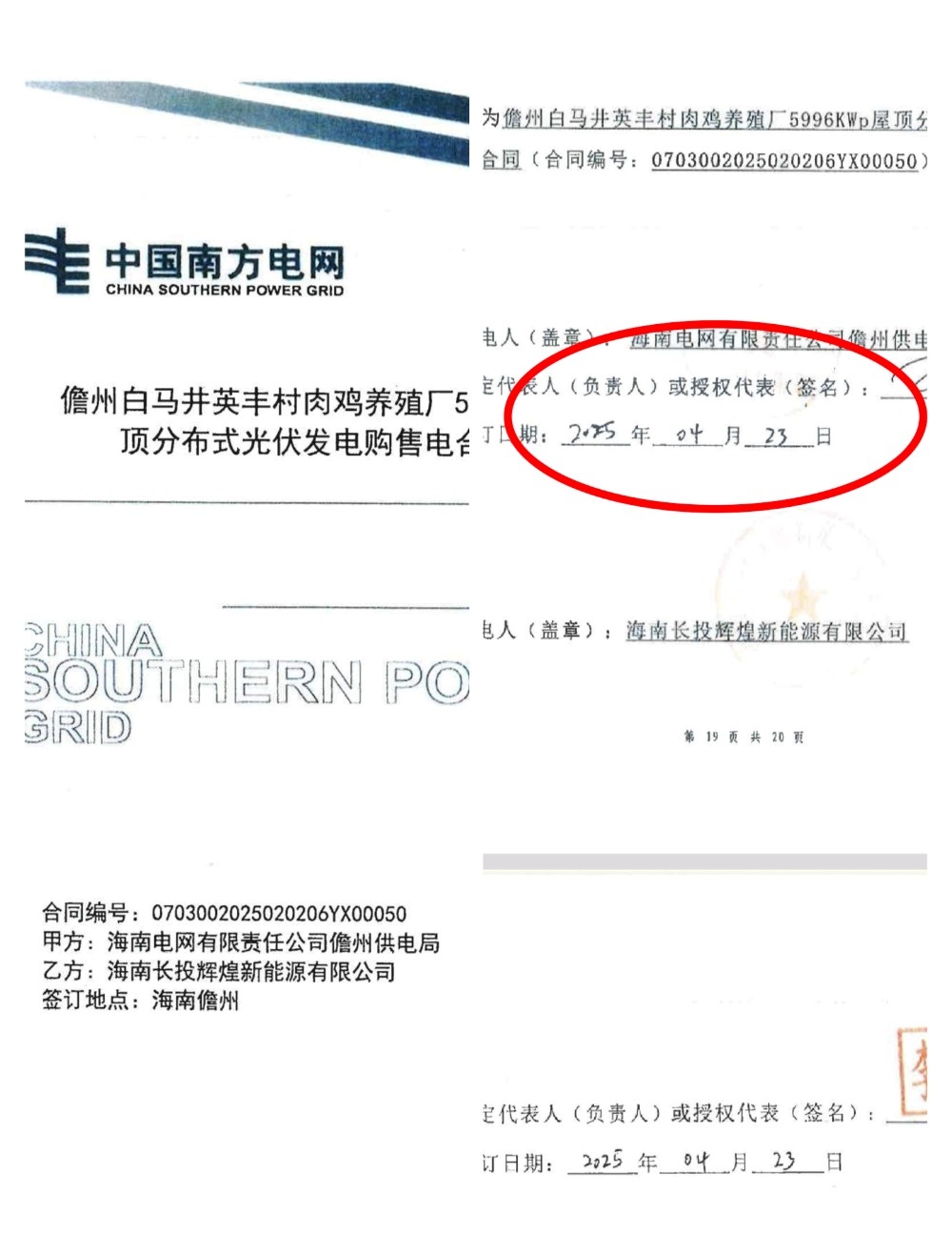 记者调查发现,涉事企业海南长投辉煌新能源有限公司(下称“海南长投辉煌”)的操作颇显仓促:今年4月23日,儋州供电局与该公司签订《儋州白马井英丰村肉鸡养殖厂5996KWp屋顶分布式光伏发电购售电合同》;仅隔7天,4月30日,该公司便向儋州供电局递交《新能源发电项目并购验收、并网调试申请表》,并于当日获受理。