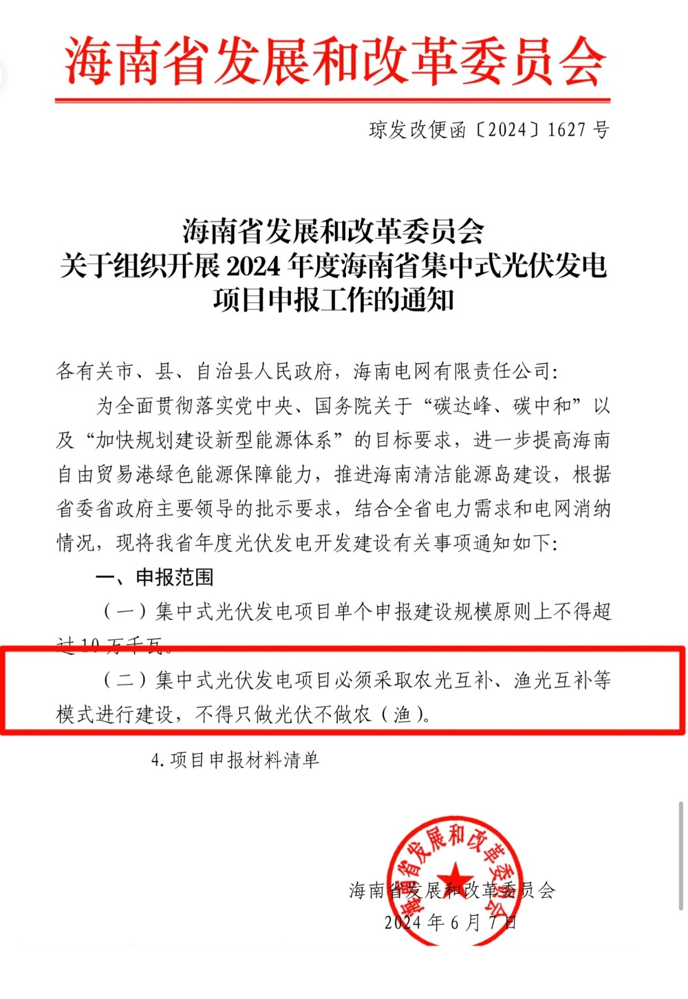 海南省发展和改革委员会发文明确:集中式光伏发电项目必须采取农光互补、渔光互补等模式进行建设,不得只做光伏不做农(渔)。