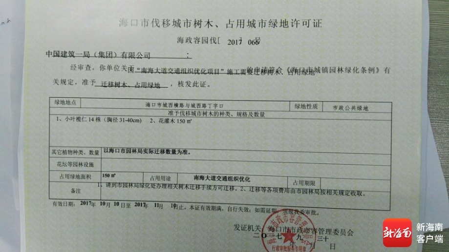 10月10日,记者向海口市绿化管理所了解情况时,该部门相关工作人员表示,城西路至城西一横路的绿化带伐移是在2017年9月经海口市市政市容管理委员会审批通过的,迁移原因是“南海大道交通组织优化项目”施工需要而迁移树木、占用绿地。该工作人员还向记者出示“海政容园伐〔2017 66〕号”海口市伐移城市树木、占用城市绿地许可证,许可证显示,当时共迁移小叶榄仁14株、花灌木150平方米。