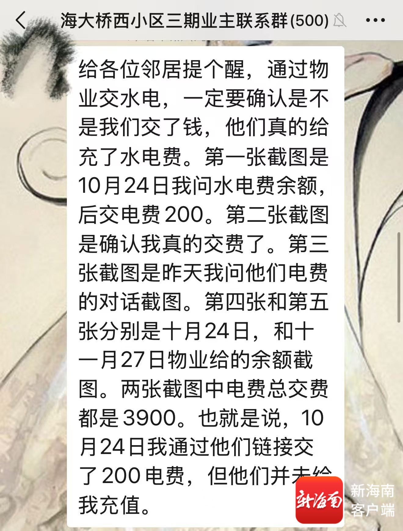 1月15日,省政府召开专题会议,研究推进住宅小区居民用水用电抄表到户工作。会议明确,这是关乎群众权益、城市治理与清廉自贸港建设的民生大事、发展要事,要求各部门、各市县加快工作进度,破解堵点难点。就在这一政策推进的背景下,业主们盼着问题得到解决。