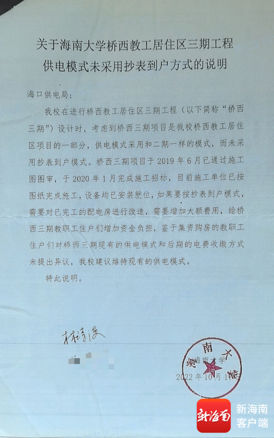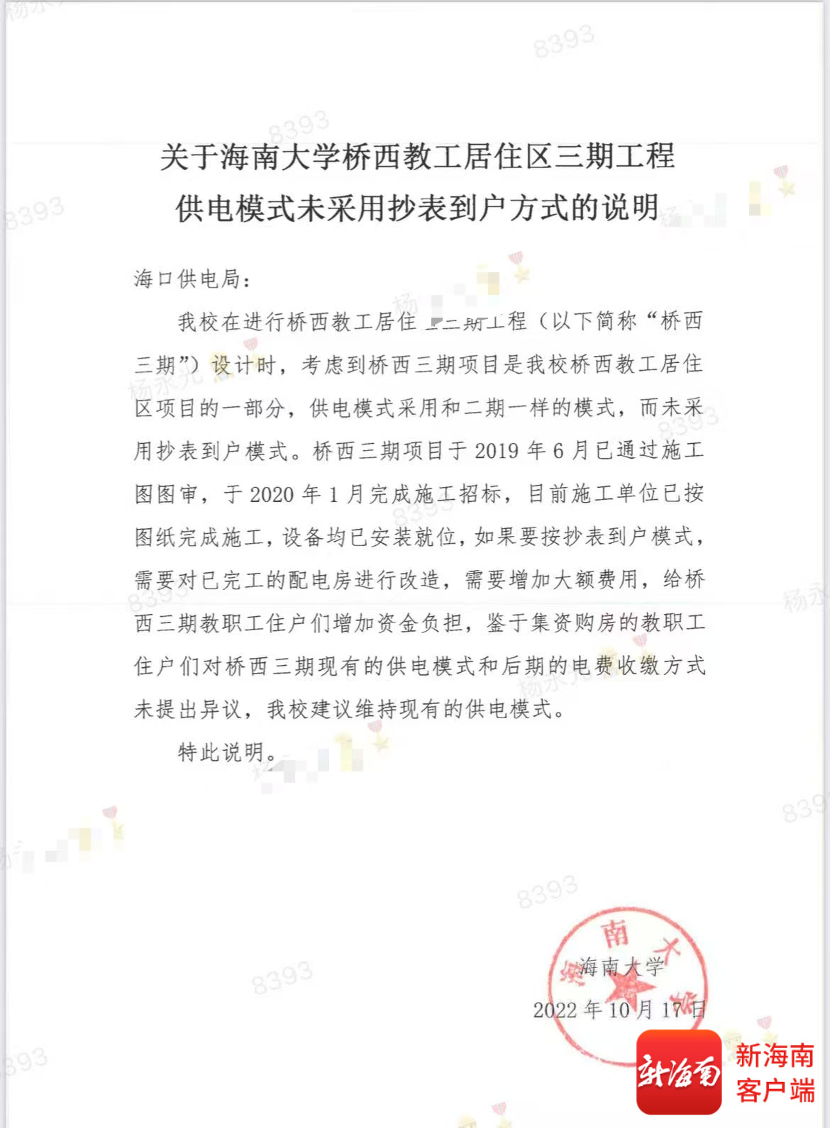 海口市住房和城乡建设局建筑工程监管科工作人员林师伟同样提供了一份海南大学给海口供电局的一份《关于海南大学桥西教工居住区三期工程供电模式未采用抄表到户的说明》。