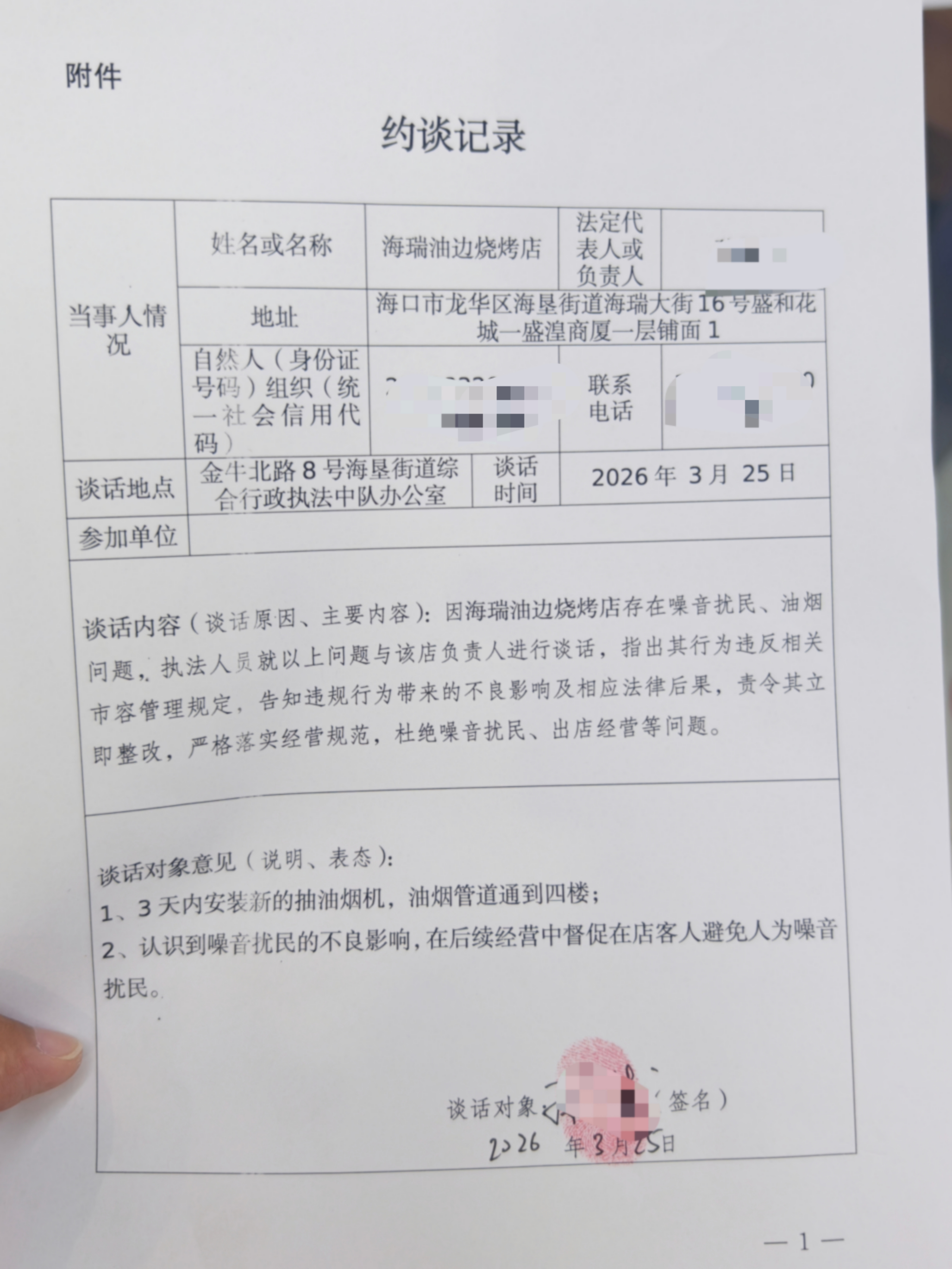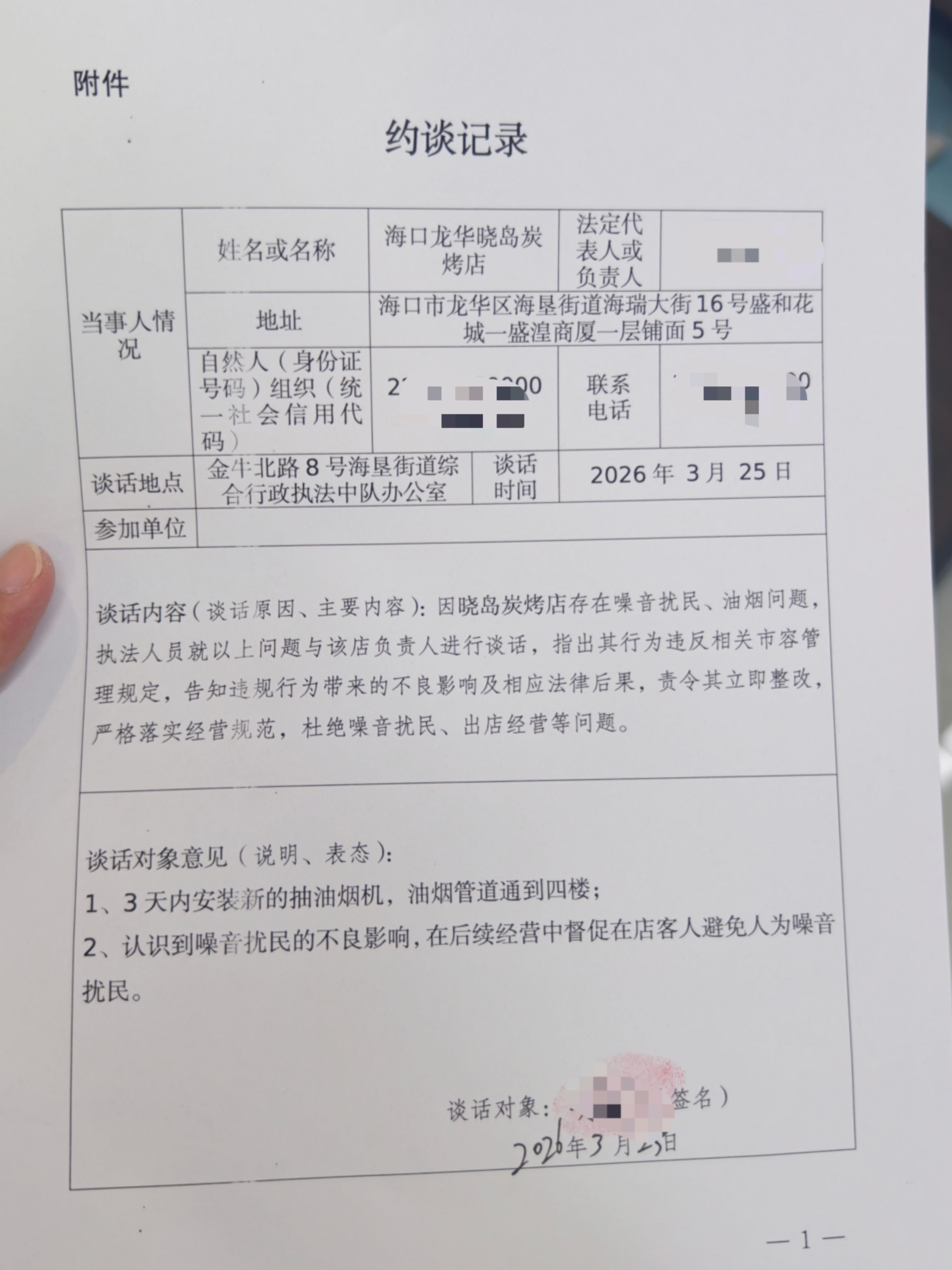3月25日上午,记者在海垦街道综合行政执法中队办公室见到了正在接受约谈的两店负责人。约谈问题主要围绕“海瑞油边烧烤店”及“晓岛炭烤”店存在噪音扰民、油烟问题,执法人员就以上问题与该店负责人进行谈话,指出其行为违反相关市容管理规定,告知违规行为带来的不良影响及相应法律后果,责令其立即整改严格落实经营规范,杜绝噪音扰民、出店经营等问题。