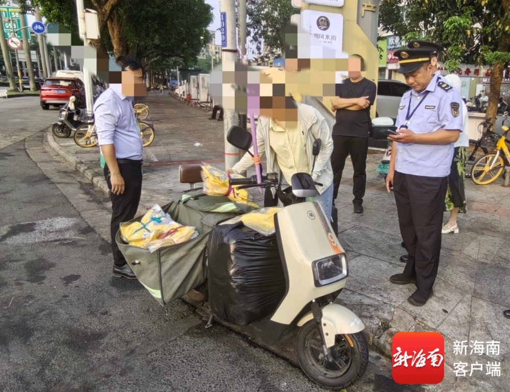 执法人员对海口校园周边流动摊点销售的校服进行调查。海口市教育局供图